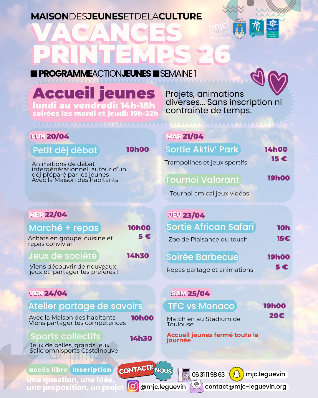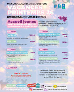 Programme Vacances de Printemps par MJC | Avr 10, 2026 | Actualité Le programme des vacances de printemps est disponible ! Infos et inscriptions auprès de l’équipe d’animation